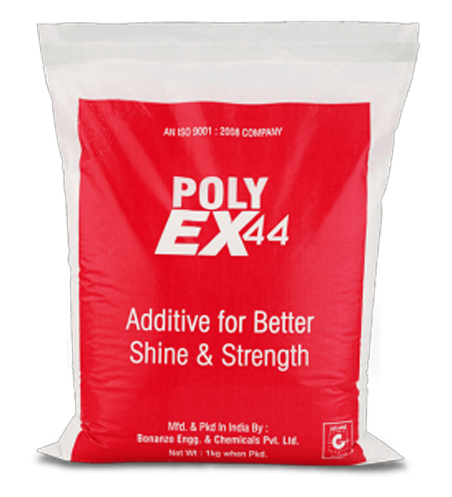 Poly-Ex44 is an unique product which has been formulated keeping in view the requirement of Indian Virgin + Recycling Industry. This not only enhances the properties of virgin + recycled polymer but takes care of finished products made out of it. It enhances the basic properties of the polymer and helps during processing stage by lowering the temp of fusion and increasing melt flow. This results in higher rate of production, thus saving in power / electricity consumption [It depends upon type and quality of basic polymer]. Further there is no need to add additional desiccant if moisture content is within permissible limits